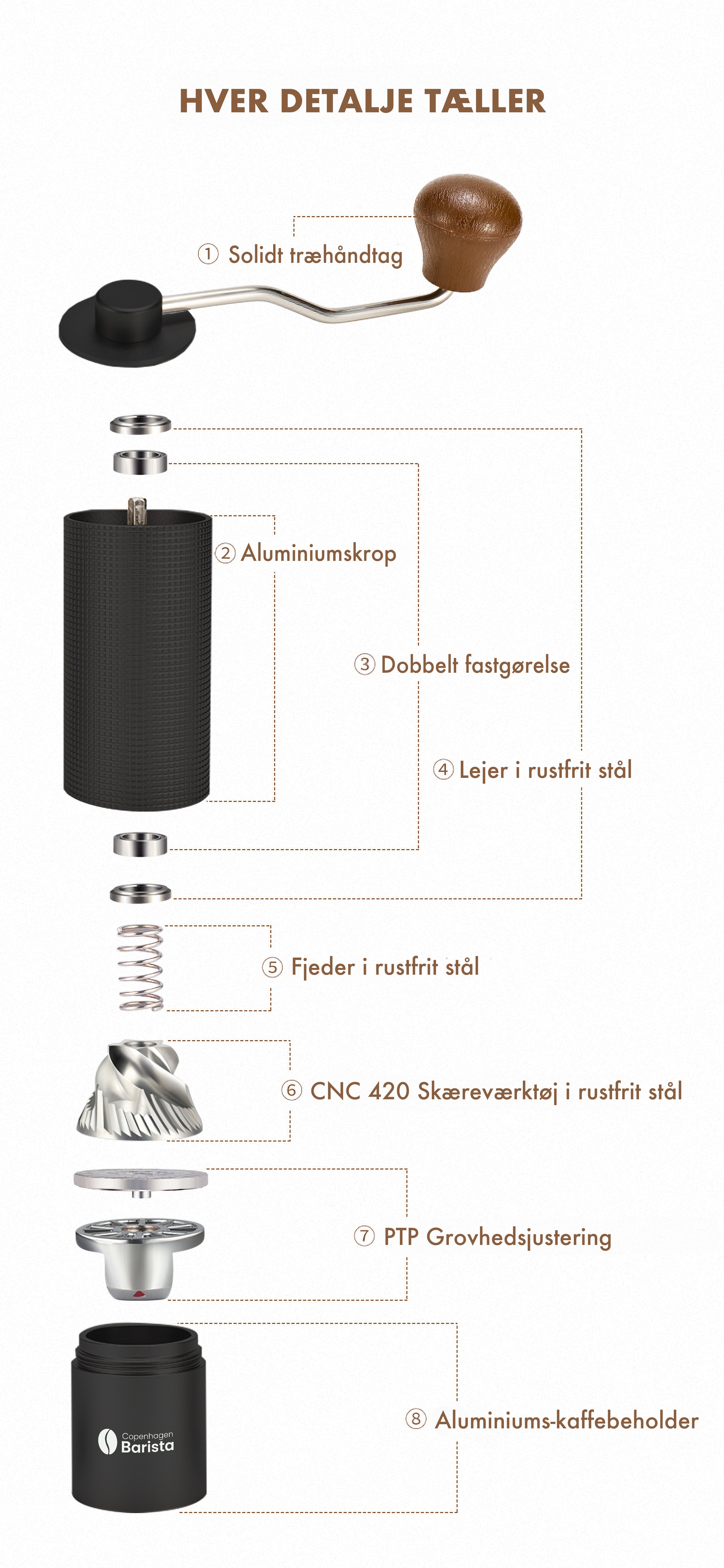 Copenhagen Barista Premium Kaffekværn er designet til at levere præcisionsformaling, ensartet partikelstørrelse og optimal ekstraktion – hver eneste gang. Med en præcis justeringsmekanisme og præcisionsfræste koniske burrs i rustfrit stål, er denne kværn skabt til alt fra espresso til pour-over og French press.